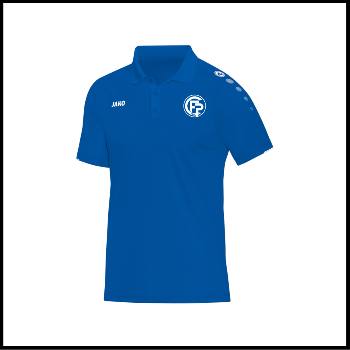 (Kinder) Polo Classico von JAKO in royal, bedruckt mit dem "1.FC Pforzheim" Logo in weiß auf der linken Brustseite und dem Schriftzug "1.FC Pforzheim" auf dem Rücken. Wahlweise mit kleiner Nummer oder Initialien in weiß unten rechts auf der Vorderseite.